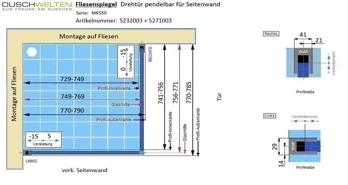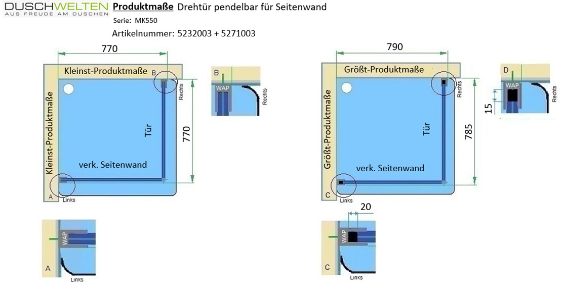 - Das Produktmaß der Seitenwand ist immer in Kombination mit der Tür zu betrachten