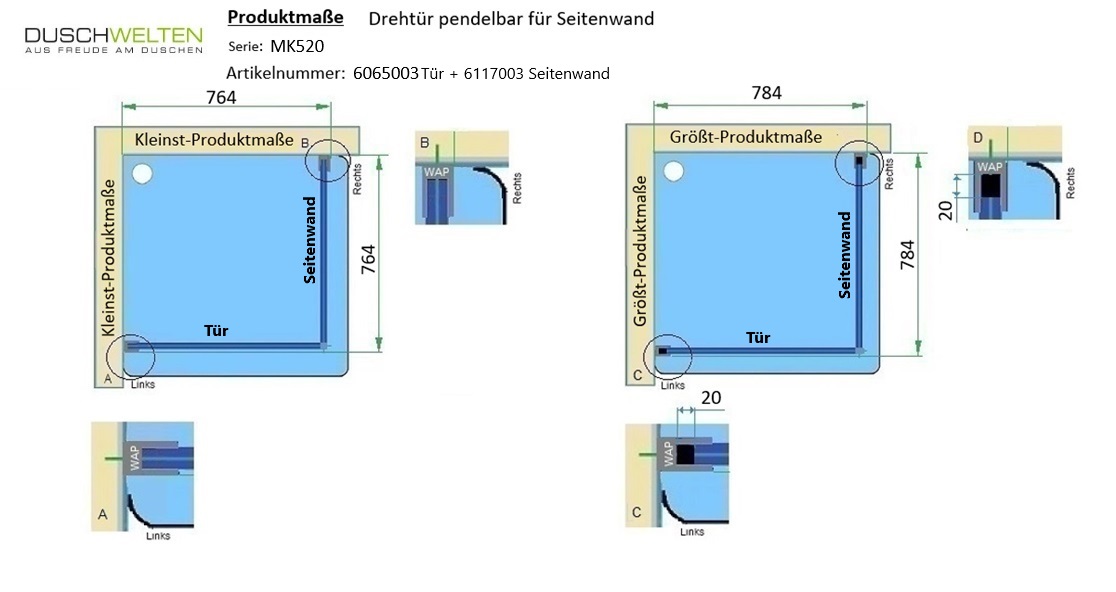 Maß | Maß-Typ | Produktmaß | Wanneneinbaumaß | Fliesenmaß (Gaslmitte auf Fuge) | Einstiegsbreite | Höhe + 35 mm Stabi. | |||