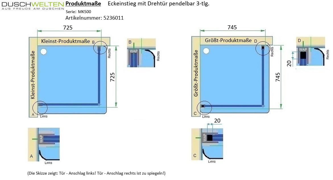 Produktinformationen "MK 500 Eckeinstieg Kombination, Drehtür links + Drehtür mit Festteil rechts"