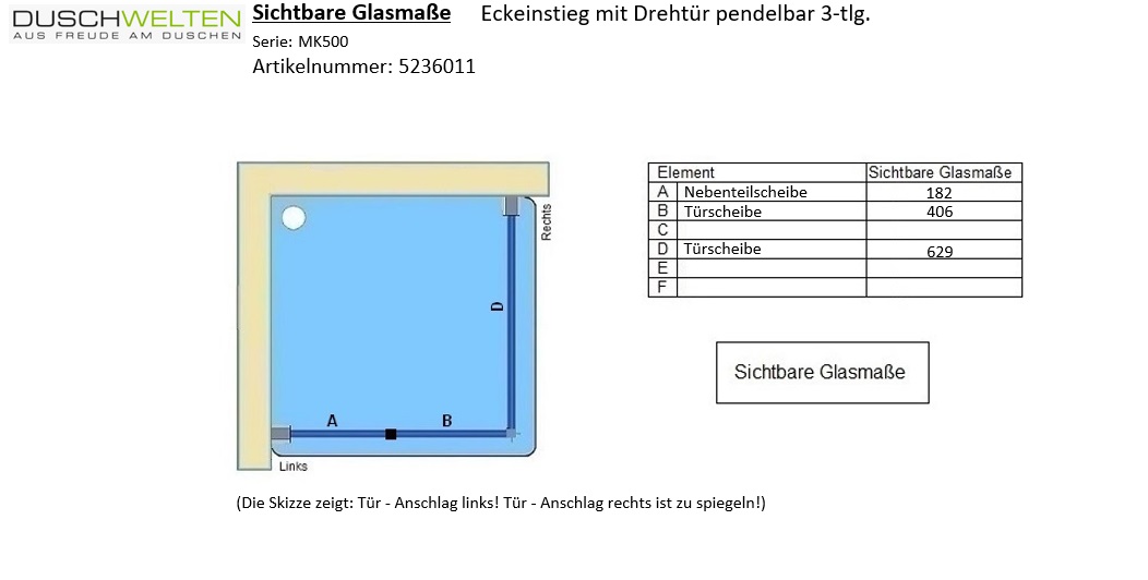 - Auch erhältlich mit Drehtür rechts, Drehtür mit Festteil links erhältlich: Typ 5237
