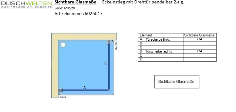 Eckeinstieg Drehtür 2-teilig mit Eckeinstieg Drehfalttür kombinierbar.
