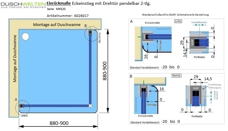 | Maß | Maß-Typ | Produktmaß (je Seite) | Wanneneinbaumaß (je Seite) | Fliesenmaß (Glasmitte auf Fuge) (je Seite) | Einstiegsbreite | Höhe |
