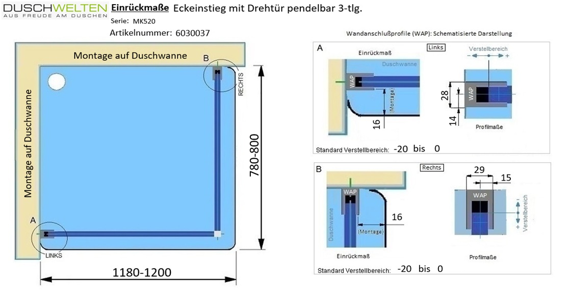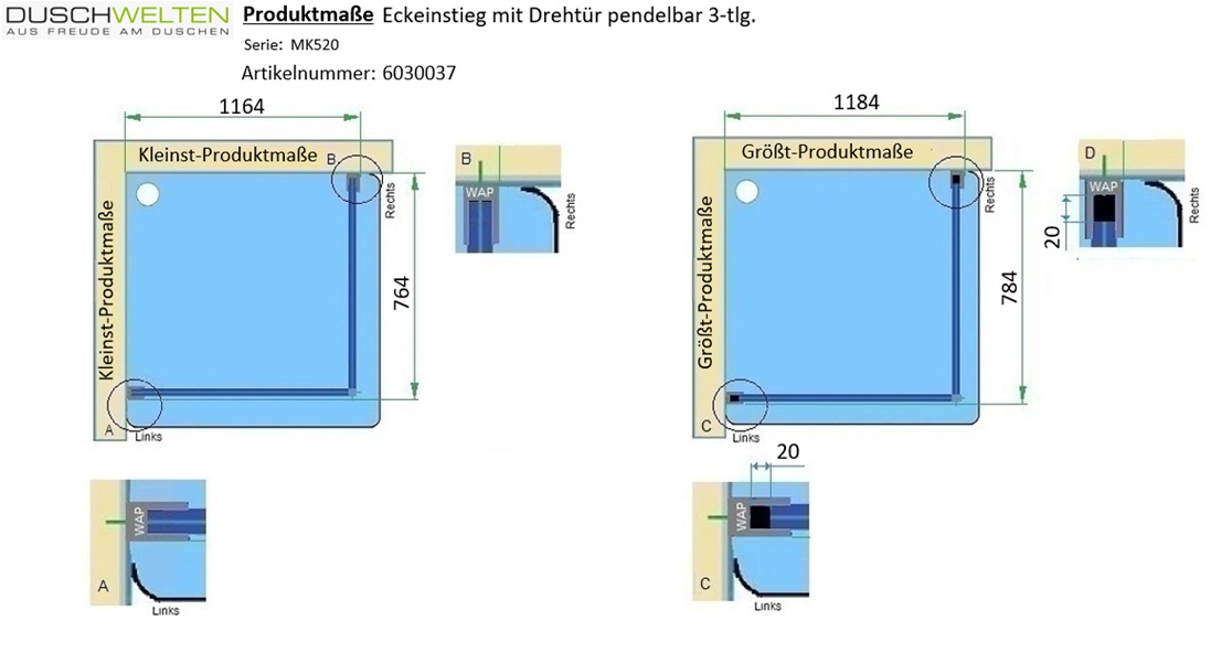 Produktinformationen "MK 520 eckig Eckeinstieg Kombination Drehtür mit Festteil links / Drehtür rechts, eckig"