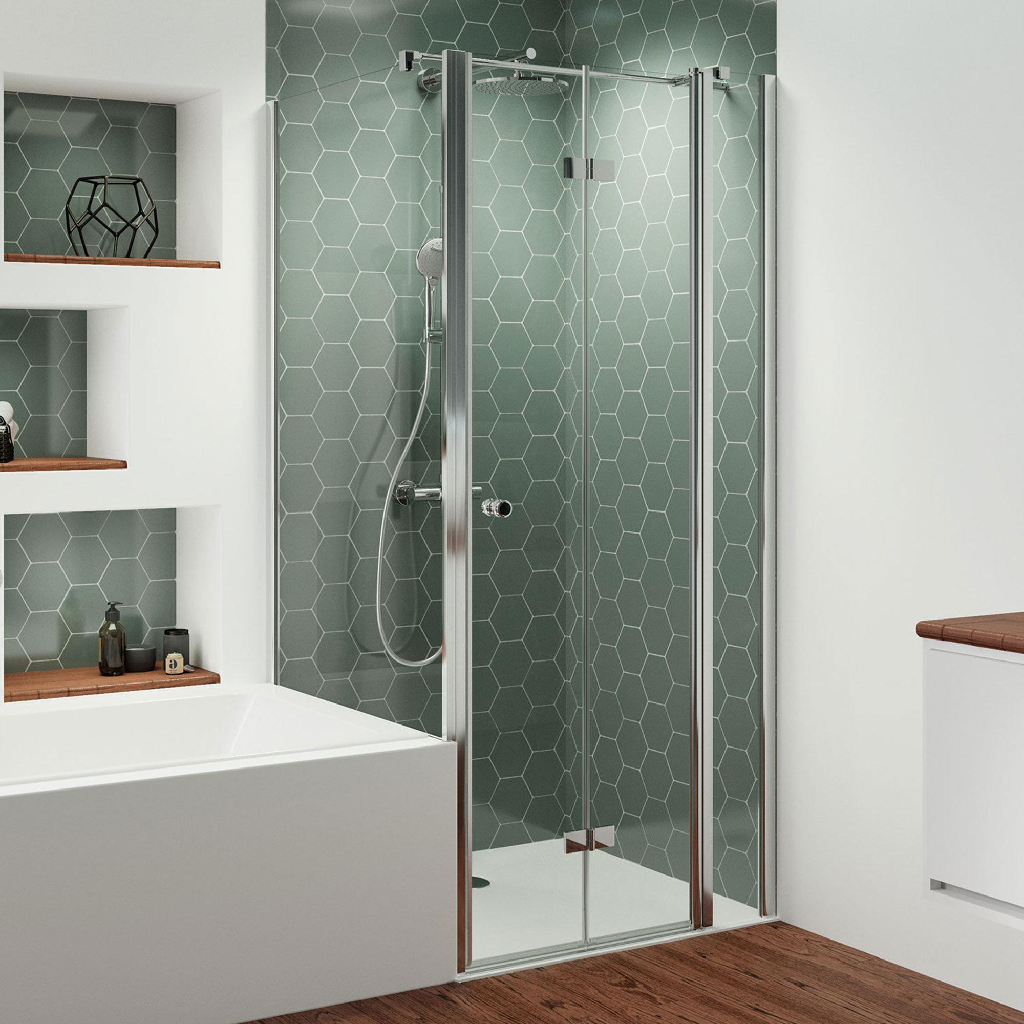 - Drehfalttür mit Festteil für Nische oder zur Kombination mit Badewannenseitenwand auf der Wanne (Typ 6075 links)