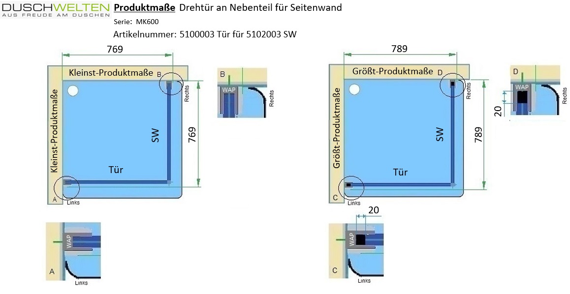 - zur Kombination mit einer MK600 Seitenwand (Typ 5102) oder Badewannenseitenwand (Typ 5115)