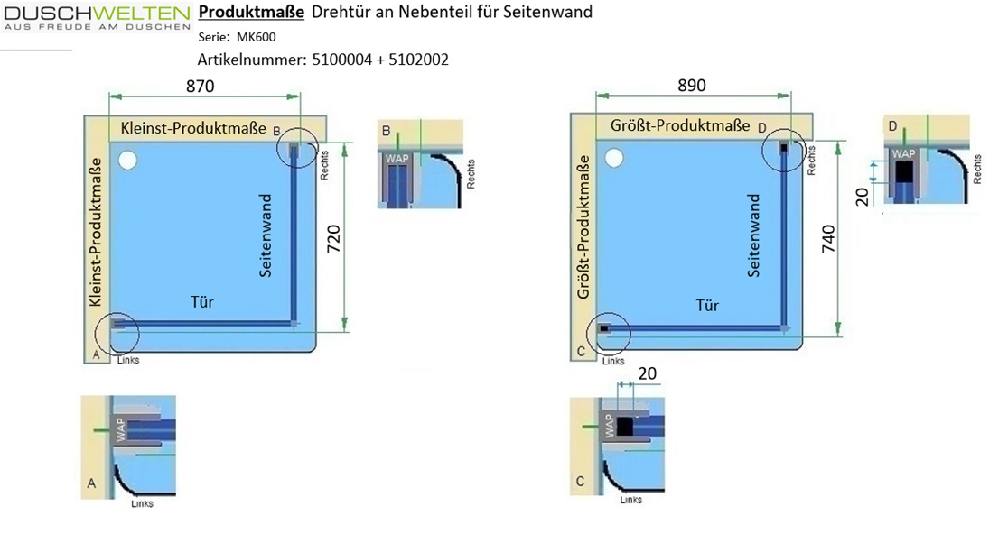 Produktinformationen "MK 600 Seitenwand (Anschlag frei wählbar) für Drehtür mit Festteil"