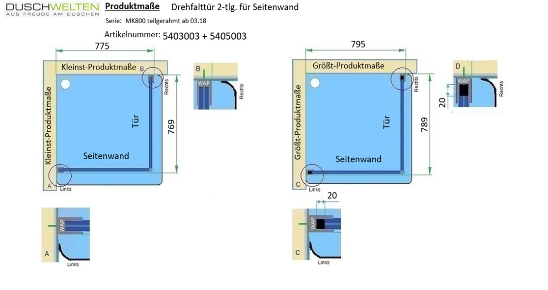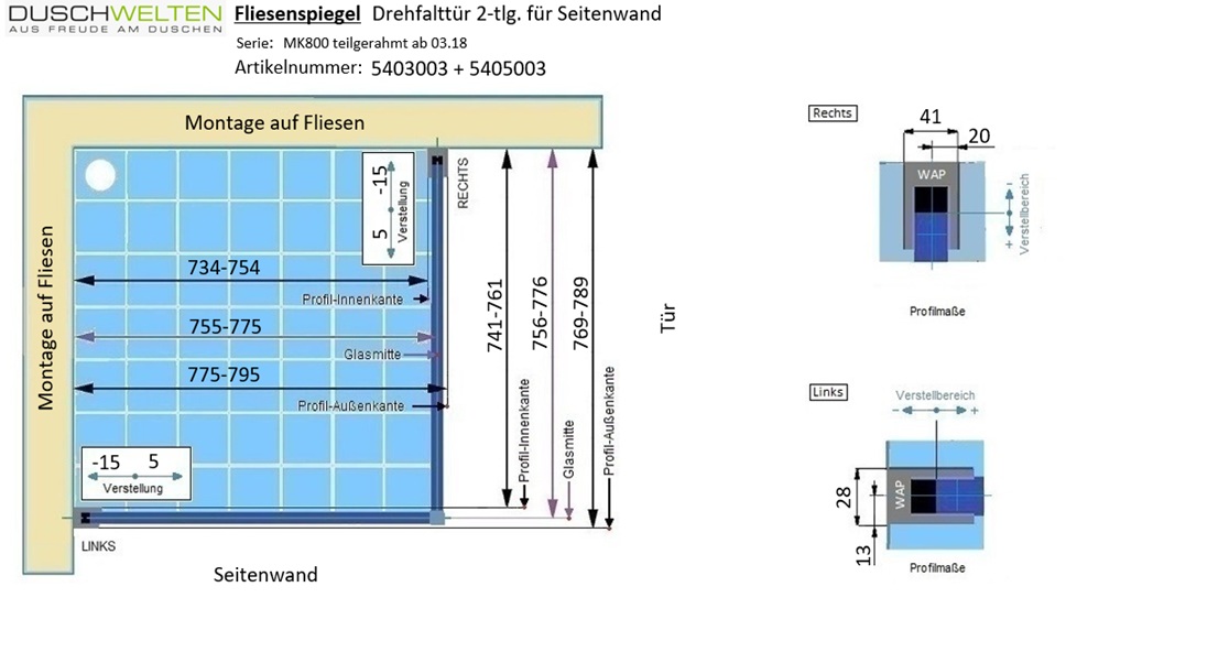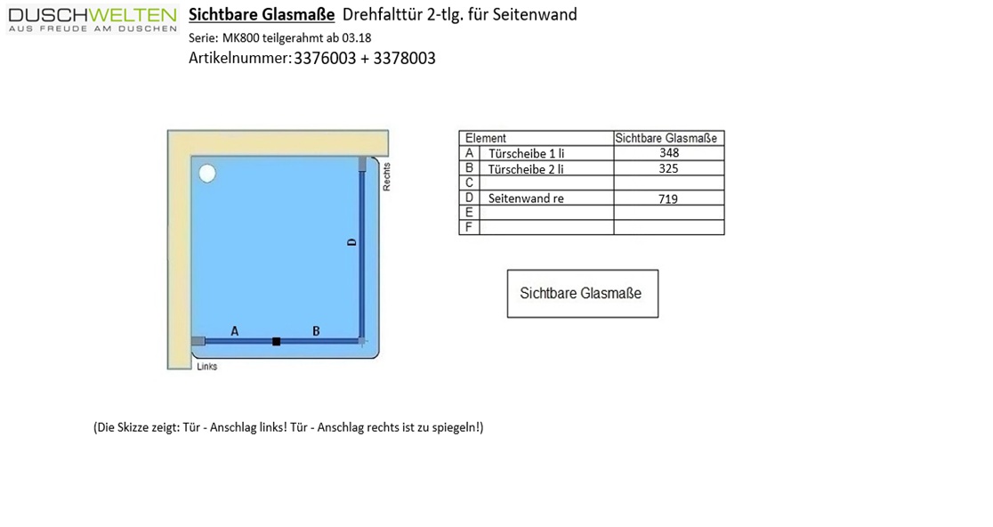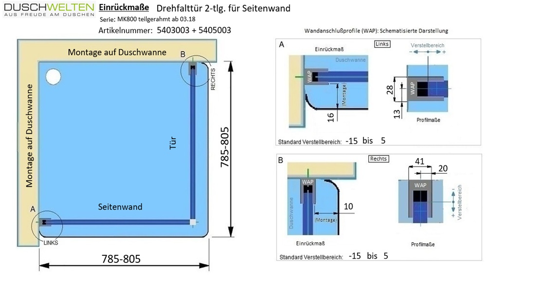 Maß | Maß-Typ | Produktmaß | Wanneneinbaumaß | Fliesenmaße (Glasmitte auf Fuge) | Falttiefe | Einstiegsbreite | Höhe + 35mm Stabilisator |