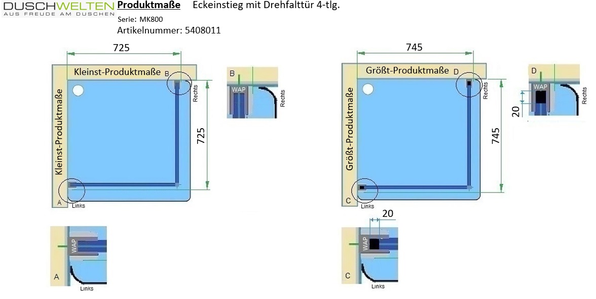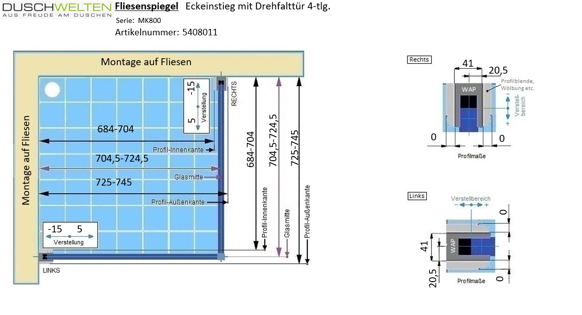 Maß | Maß-Typ | Produktmaß (links/rechts) | Wanneinbaumaß (links/rechts) | Fliesenmaß (Glasmitte auf Fuge) (links/rechts) | Einstiegsbreite | Höhe |