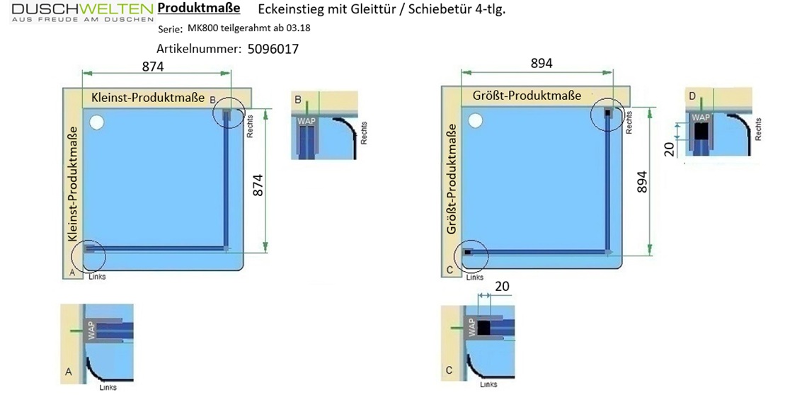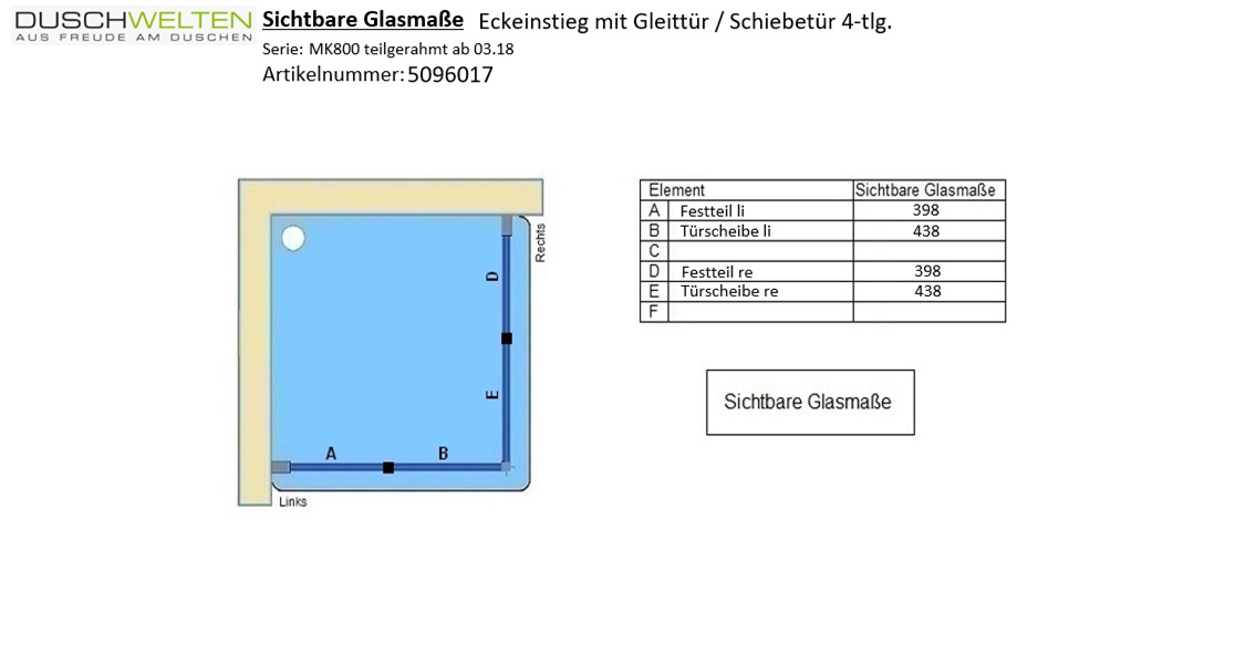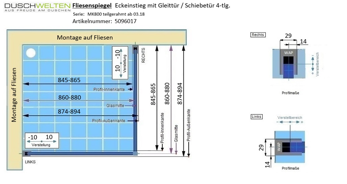 Maß | Maß-Typ | Produktmaß (links/rechts) | Wanneinbaumaß (links/rechts) | Fliesenmaß (Glasmitte auf Fuge) (links/rechts) | Einstiegsbreite | Höhe |