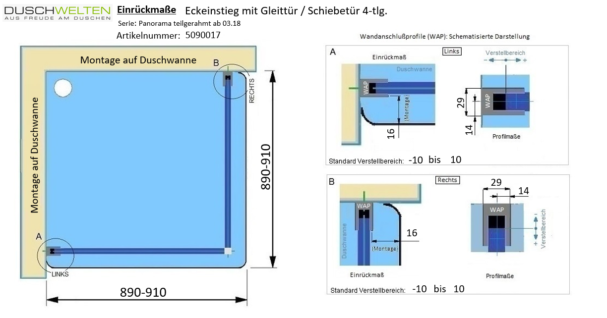 Maß | Maß-Typ | Produktmaß (links/rechts) | Wanneinbaumaß (links/rechts) | Fliesenmaß (Glasmitte auf Fuge) (links/rechts) | Einstiegsbreite | Höhe |