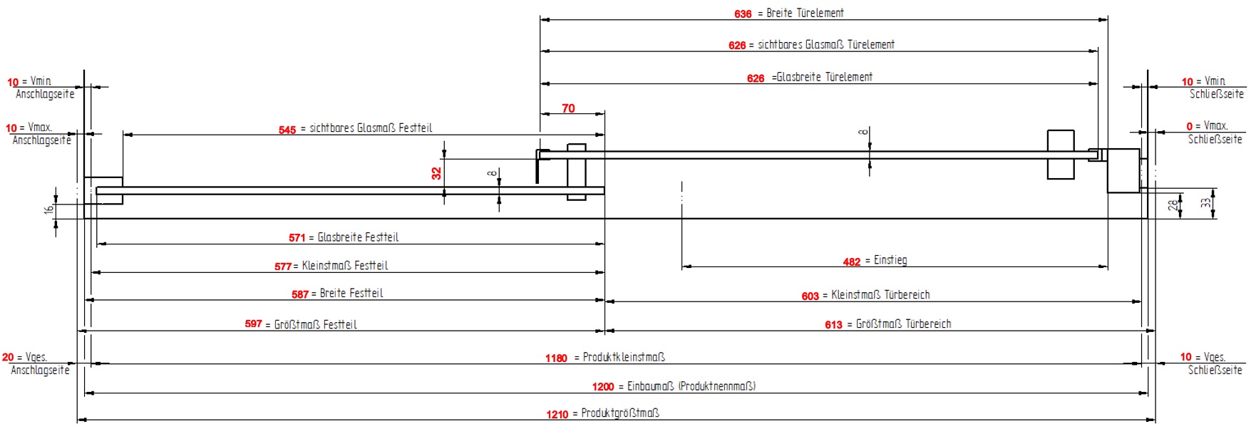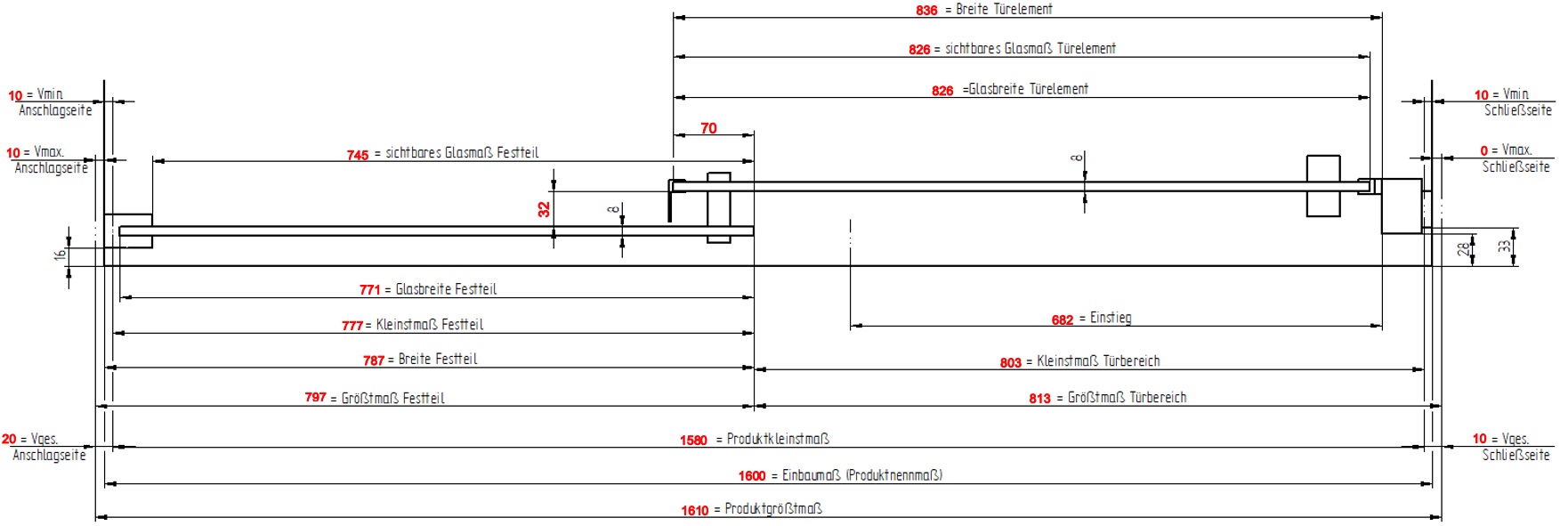 Die max. Laufschinenlänge beträgt 1469 mm. Bei Schiebetüren größer 1600 mm hat das Türelement ein Festmaß von 826 mm, somit entsteht eine Lücke zwischen Wandanschlussprofil und Beginn der Laufschiene.