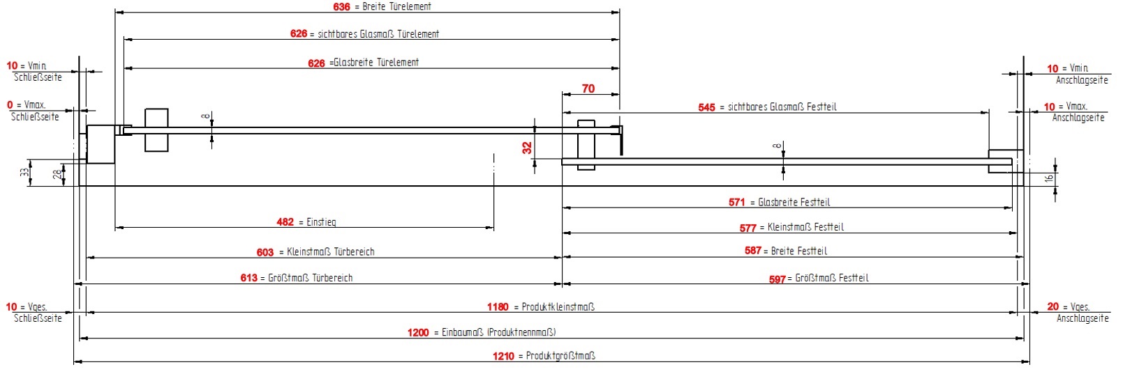 Die max. Laufschinenlänge beträgt 1469 mm. Bei Schiebetüren größer 1600 mm hat das Türelement ein Festmaß von 826 mm, somit entsteht eine Lücke zwischen Wandanschlussprofil und Beginn der Laufschiene.