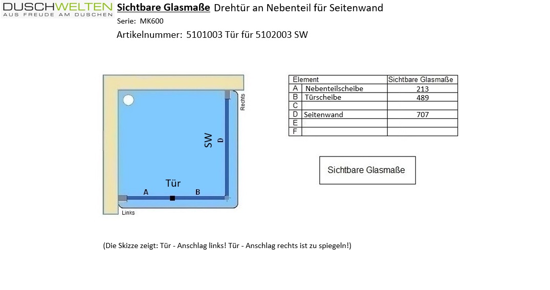Produktinformationen "MK600 Drehtür mit Festteil, Anschlag rechts, für Seitenwand/Badewannenseitenwand"