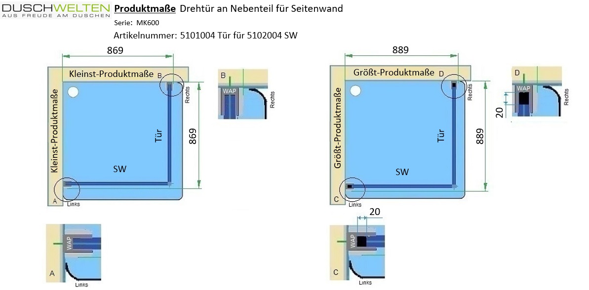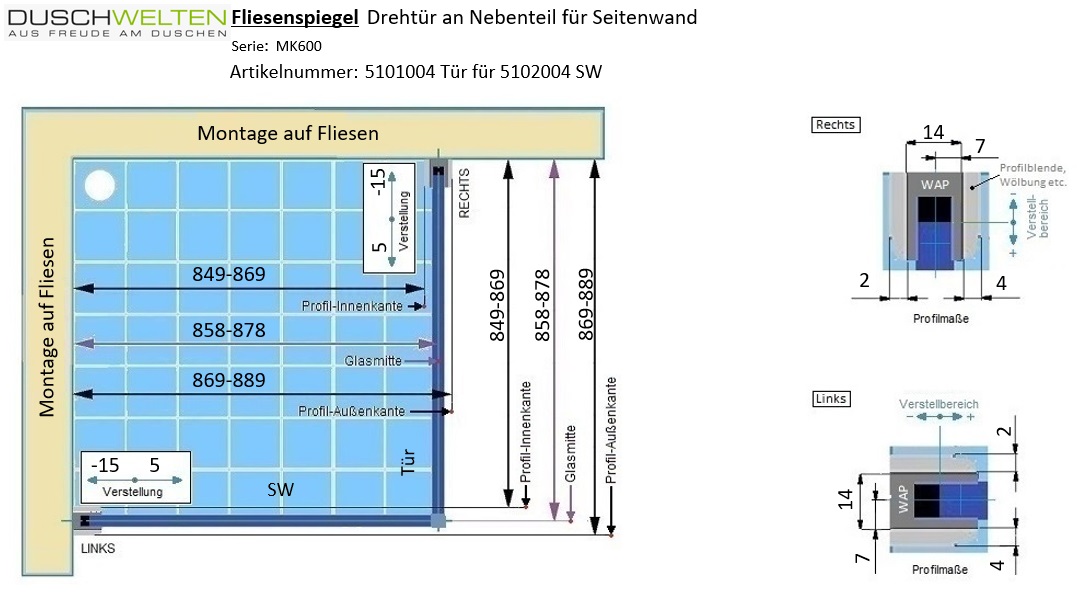 - zur Kombination mit einer MK600 Seitenwand (Typ 5102) oder Badewannenseitenwand (Typ 5115)